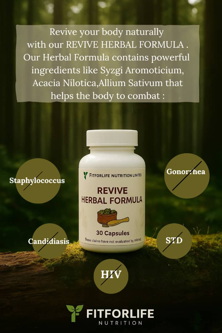 Revive Herbal Formula Focus: Anti-Infection • Antibacterial • Antifungal Protects the body against common infections (malaria, typhoid, bacterial illnesses). Supports natural defense against fungal and yeast infections. Helps the body recover faster from sickness and strengthens natural resilience. Ideal for people exposed to frequent infections due to stress, environment, or weak immunity. Revive Herbal Formula “Stay protected, stay strong.”
